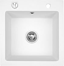 Évier en granit avec siphon | 48 x 50 cm | Évier simple pour meuble bas à partir de 45 cm | Évier de cuisine en granit | Évier intégré avec bonde pop-up et trop-plein (2. Siphon (automatique), blanc)